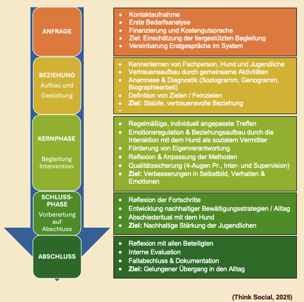 Der Fokus liegt auf Aussensettings, wobei die Natur als kraftvoller Lernraum dient. Der Therapiehund unterstützt dabei als zusätzlicher Motivator und agiert als lebendiges Vorbild für positive wie auch negative Verhaltensweisen.
